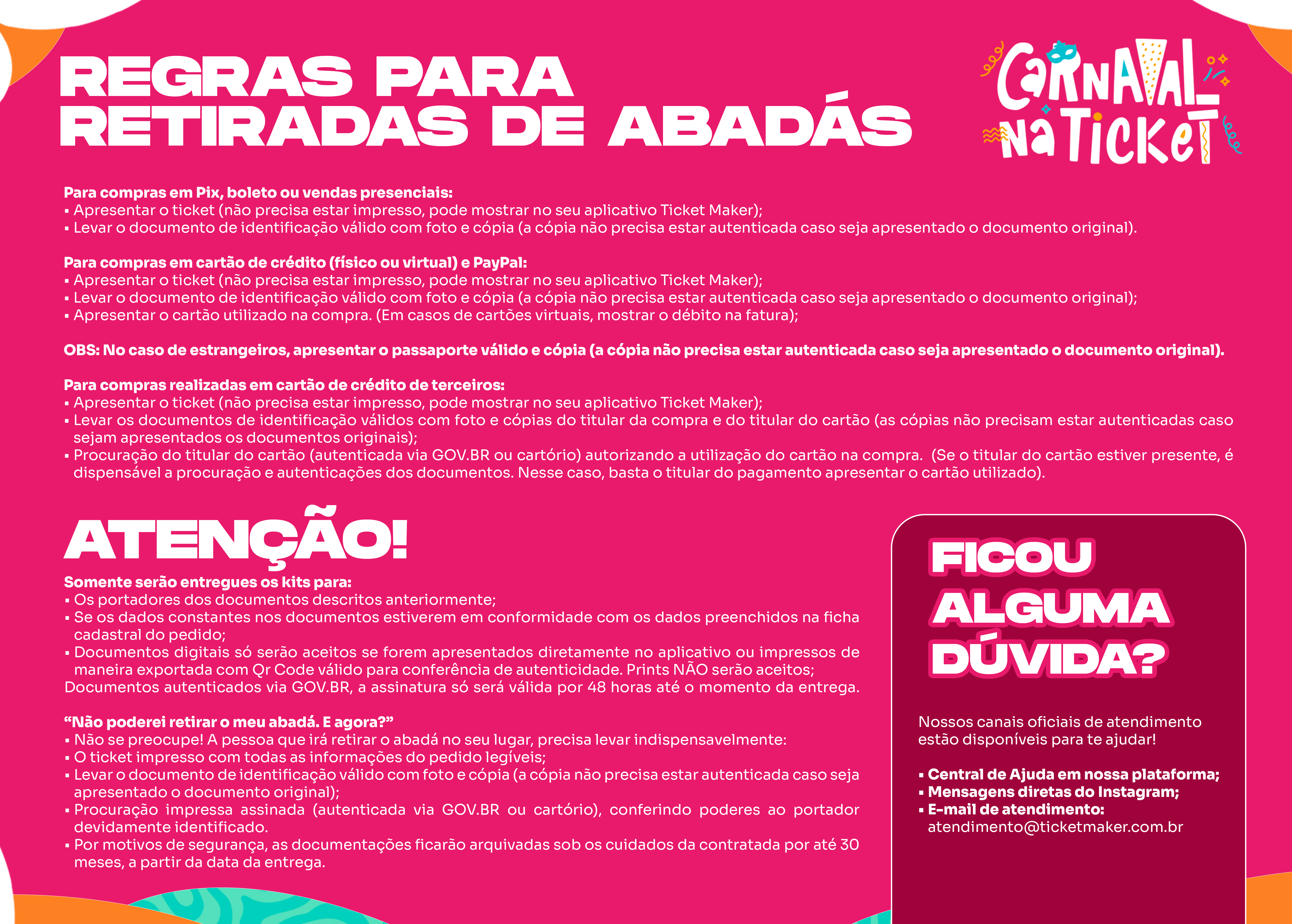 Não se preocupe! A pessoa que irá retirar o abadá no seu lugar, precisa levar:
